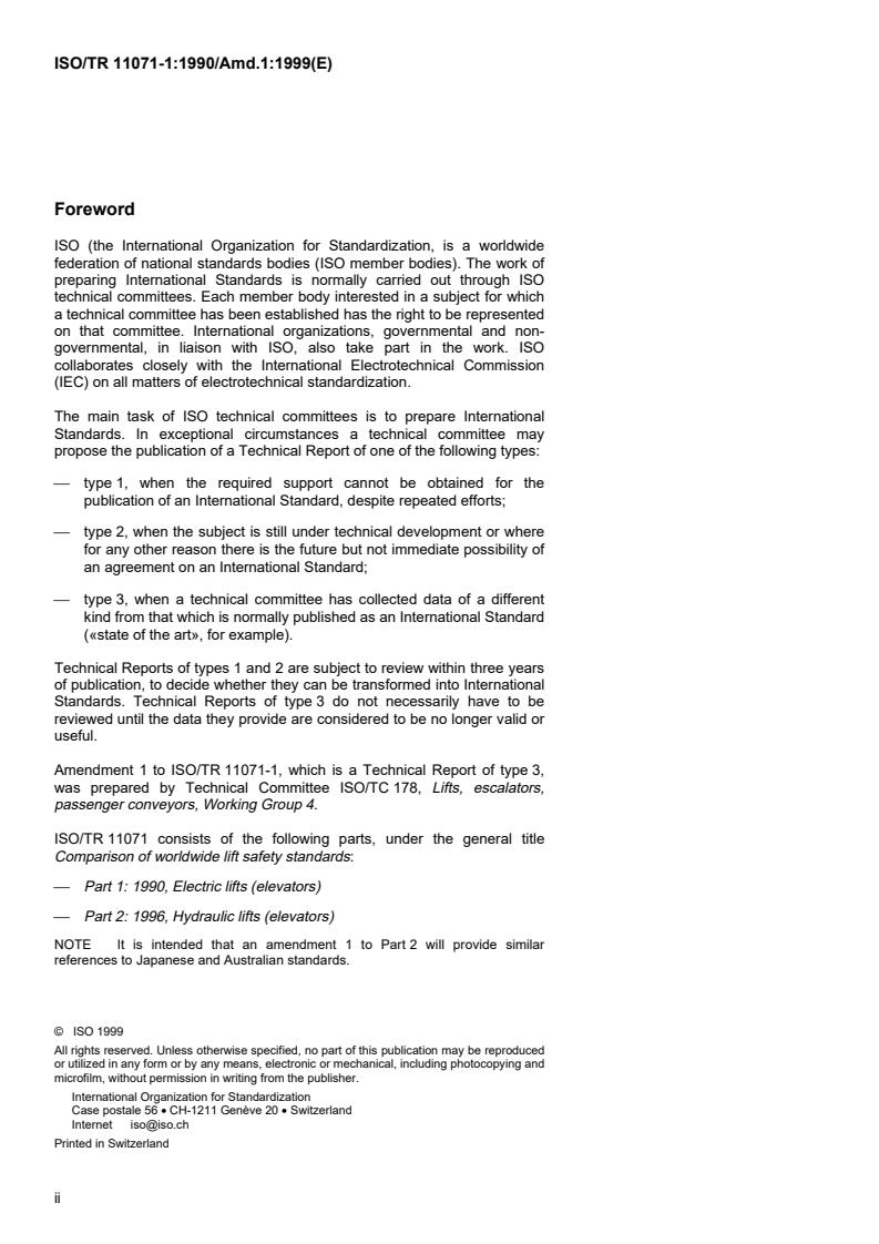 ISO/TR 11071-1:1990/Amd 1:1999 is a technical report published by the International Organization for Standardization (ISO). Its full title is "Comparison of worldwide lift safety standards — Part 1: Electric lifts (elevators) — Amendment 1: References to Japanese standards". This standard covers: Comparison of worldwide lift safety standards — Part 1: Electric lifts (elevators) — Amendment 1: References to Japanese standards