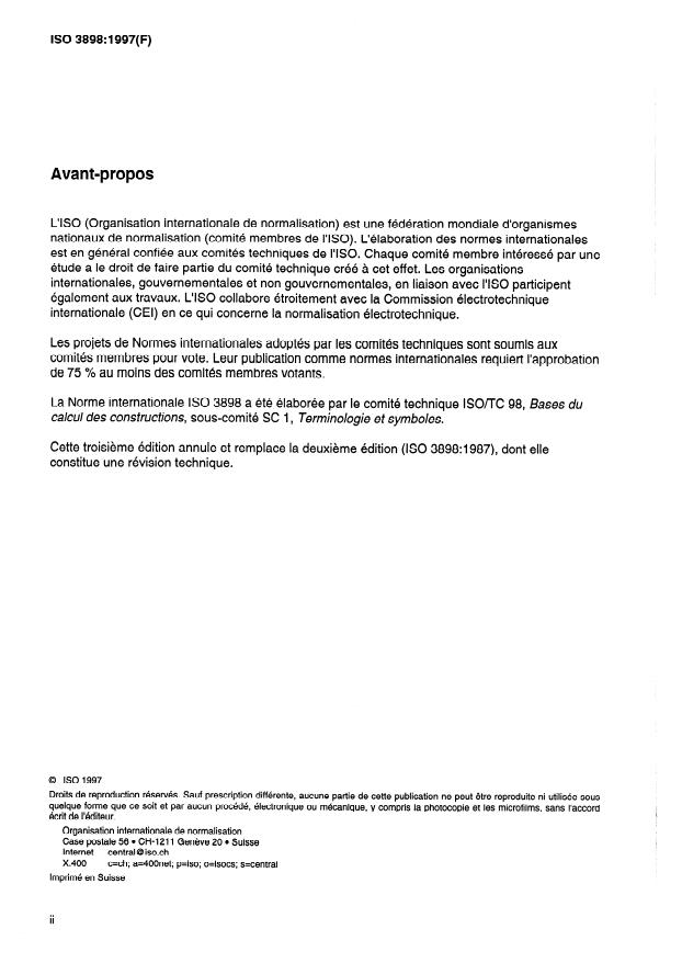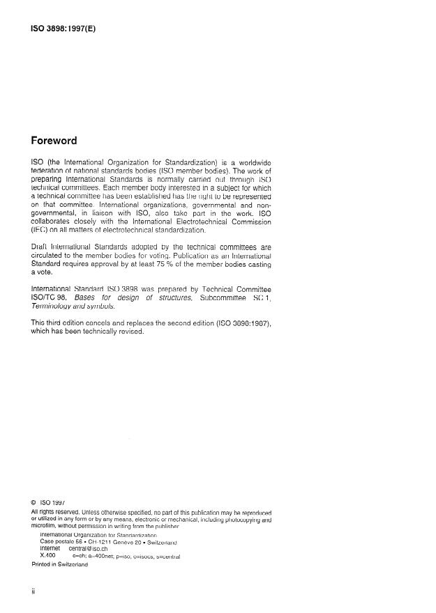 ISO 3898:1997 is a standard published by the International Organization for Standardization (ISO). Its full title is "Bases for design of structures — Notations — General symbols". This standard covers: Bases for design of structures — Notations — General symbols