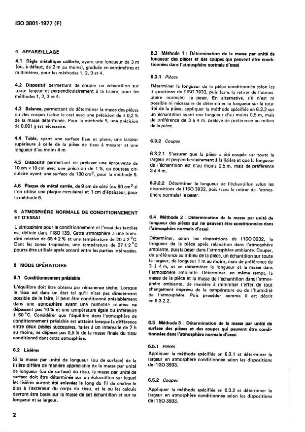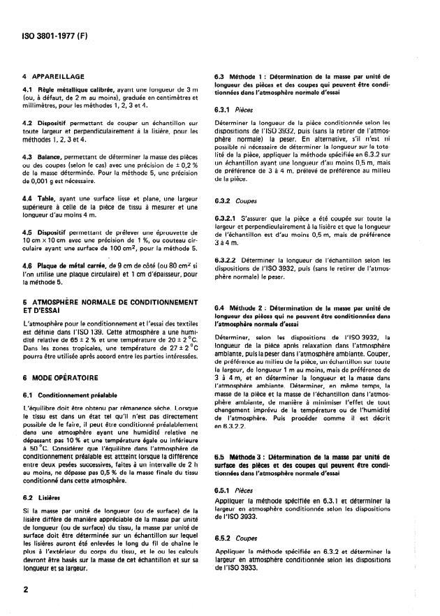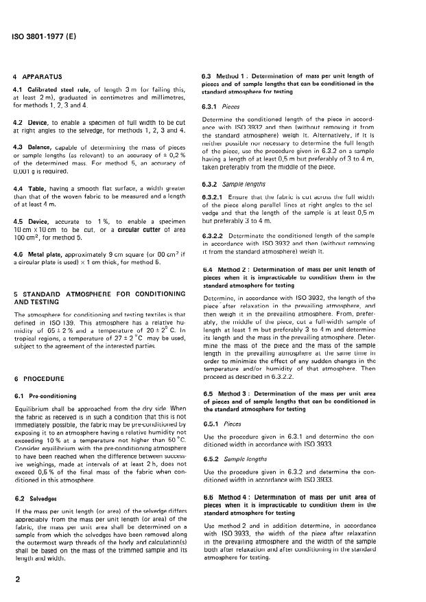 ISO 3801:1977 is a standard published by the International Organization for Standardization (ISO). Its full title is "Textiles - Woven fabrics - Determination of mass per unit length and mass per unit area". This standard covers: For some fabrics, mass per unit length and mass per unit area are related simply by the width of the fabric, but for other fabrics variations in structure may introduce an important distinction between mass per unit length and mass per unit area. The methods are applicable to woven fabrics (including those of "stretch" type) made up full width or folded down the middle, and apply to the determination of the fabric mass of complete pieces as well as of sample length.