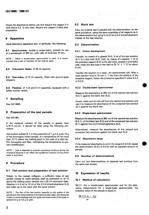ISO 6885:1988 - Animal and vegetable fats and oils -- Determination of anisidine value