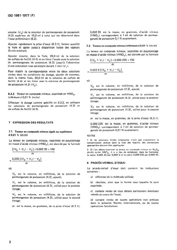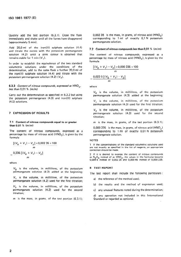 ISO 1981:1977 is a standard published by the International Organization for Standardization (ISO). Its full title is "Nitric acid for industrial use — Determination of nitrous compounds — Titrimetric method". This standard covers: Two cases are considered: content of nitrous compounds, expressed as HNO2, equal to or greater than 0,01 % (m/m) and content of nitrous compounds, expressed as HNO2, less than 0,01 % (m/m). The principle consists in oxidatiuon of the compounds present in a test portion by an excess of standard volumetric potassium permanganate solution. Addition of an excess of a standard volumetric iron(II) sulphate solution, and titration of this excess with a standard volumetric potassium permanganate solution. Replaces ISO Recommendation R 1981-1971.