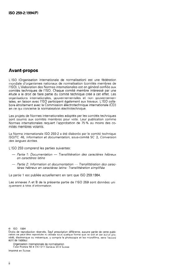 ISO 259-2:1994 is a standard published by the International Organization for Standardization (ISO). Its full title is "Information and documentation - Transliteration of Hebrew characters into Latin characters - Part 2: Simplified transliteration". This standard covers: Specifies a simplified system for the transliteration of Hebrew characters into Latin characters. This simplification of the stringent rules established by ISO 259:1984 is especially intended to make easier the processing of bibliographic information.