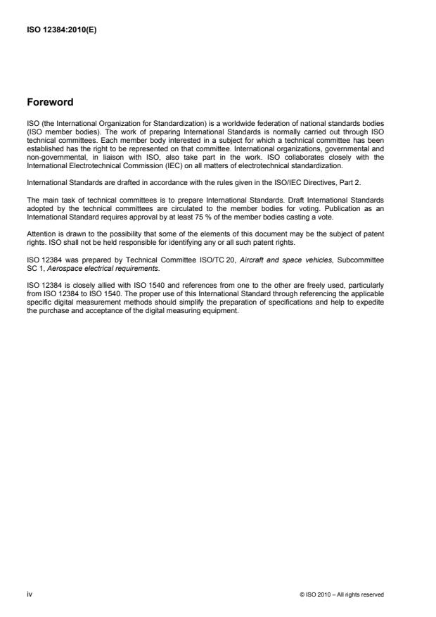 ISO 12384:2010 is a standard published by the International Organization for Standardization (ISO). Its full title is "Aerospace - Requirements for digital equipment for measurements of aircraft electrical power characteristics". This standard covers: ISO 12384:2010 specifies the requirements for digital measuring methods and digital measuring equipment for aircraft electrical power characteristics, including accuracy, algorithms and digital measuring equipment. The measuring equipment should be applied mainly for the use of laboratory or rig tests. ISO 12384:2010 can be applied to digital measuring equipment which is involved in the measurement of power electrical characteristics of the power supply system, power distributing systems and the utilization of equipment in aircrafts.