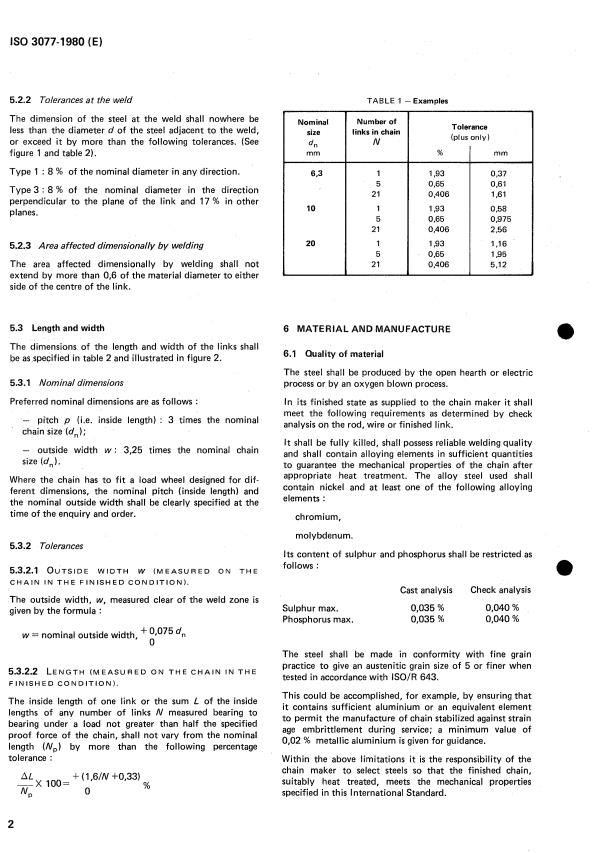 The size of chain shall be one of the sizes listed in table 2,