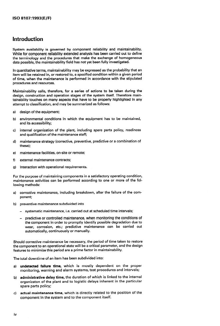 ISO 8107:1993 is a standard published by the International Organization for Standardization (ISO). Its full title is "Nuclear power plants - Maintainability - Terminology". This standard covers: Identifies the typical parameters and terms necessary for collecting and exchanging maintainability data. The definitions are valid for corrective maintenance. For preventive maintenance, a similar classification can be drawn up. The general guidelines on the exchange of reliability data for nuclear power plants are given in ISO 6527.