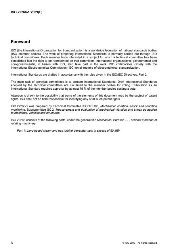 ISO 22266-1:2009 is a standard published by the International Organization for Standardization (ISO). Its full title is "Mechanical vibration — Torsional vibration of rotating machinery — Part 1: Land-based steam and gas turbine generator sets in excess of 50 MW". This standard covers: ISO 22266-1:2009 provides guidelines for applying shaft torsional vibration criteria, under normal operating conditions, for the coupled shaft system and long blades of a turbine generator set. In particular, these apply to the torsional natural frequencies of the coupled shaft system at line and twice‑line frequencies of the electrical network to which the turbine generator set is connected. In the event that torsional natural frequencies do not conform with defined frequency margins, other possible actions available to vendors are defined. ISO 22266-1:2009 is applicable to land-based steam turbine generator sets for power stations with power outputs greater than 50 MW and normal operating speeds of 1 500 r/min, 1 800 r/min, 3 000 r/min and 3 600 r/min, and to land-based gas turbine generator sets for power stations with power outputs greater than 50 MW and normal operating speeds of 3 000 r/min and 3 600 r/min. Methods currently available for carrying out both analytical assessments and test validation of the shaft system torsional natural frequencies are also described.
