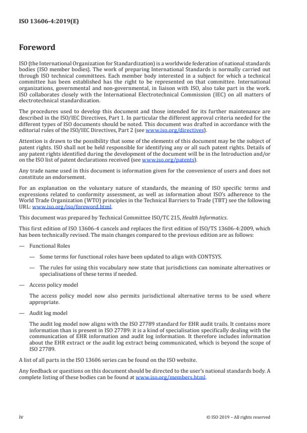 ISO 13606-4:2019 is a standard published by the International Organization for Standardization (ISO). Its full title is "Health informatics — Electronic health record communication — Part 4: Security". This standard covers: This document describes a methodology for specifying the privileges necessary to access EHR data. This methodology forms part of the overall EHR communications architecture defined in ISO 13606-1. This document seeks to address those requirements uniquely pertaining to EHR communications and to represent and communicate EHR-specific information that will inform an access decision. It also refers to general security requirements that apply to EHR communications and points at technical solutions and standards that specify details on services meeting these security needs. NOTE Security requirements for EHR systems not related to the communication of EHRs are outside the scope of this document.