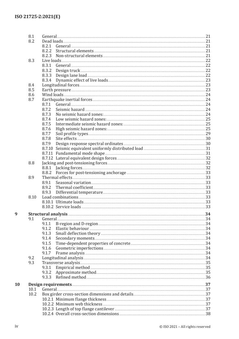ISO 21725-2:2021 is a standard published by the International Organization for Standardization (ISO). Its full title is "Simplified design of prestressed concrete bridges — Part 2: Box-girder bridges". This standard covers: This document provides information to perform the design of the prestressed concrete box girder bridge for road that complies with the limitations established in 6.1. The rules of design as set forth in the document are simplifications of more elaborate requirements. Among several erection methods of box girder bridges, the provisions of this document are mainly applicable to full staging method (FSM). Designs and details for new road bridges address structural integrity by considering the following: — the use of continuity and redundancy to provide one or more alternate paths; — structural members and bearing seat widths that are resistant to damage or instability; and — external protection systems to minimize the effects of reasonably conceived severe loads.