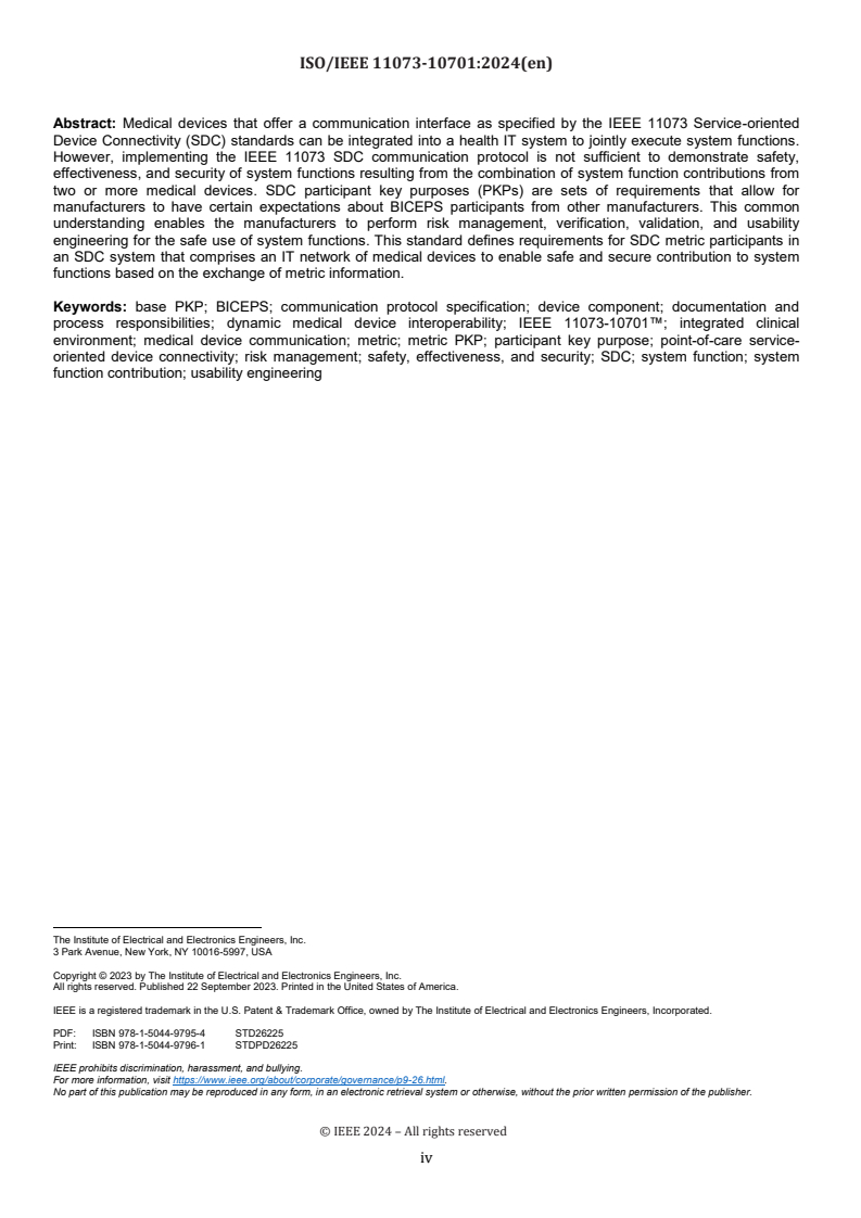 ISO/IEEE 11073-10701:2024 - "Health informatics - Device interoperability - Part 10701" defines Participant Key Purposes (PKPs) for metric data exchange in Service-oriented Device Connectivity (SDC) systems. It specifies role‑based requirements that medical device manufacturers and integrators can apply to ensure safe, effective, and secure interoperability of point‑of‑care medical devices (e.g., in ICU, OR, and other acute care settings). The standard covers both product development process and technical requirements for SDC metric participants so they can contribute metric information to shared system functions.