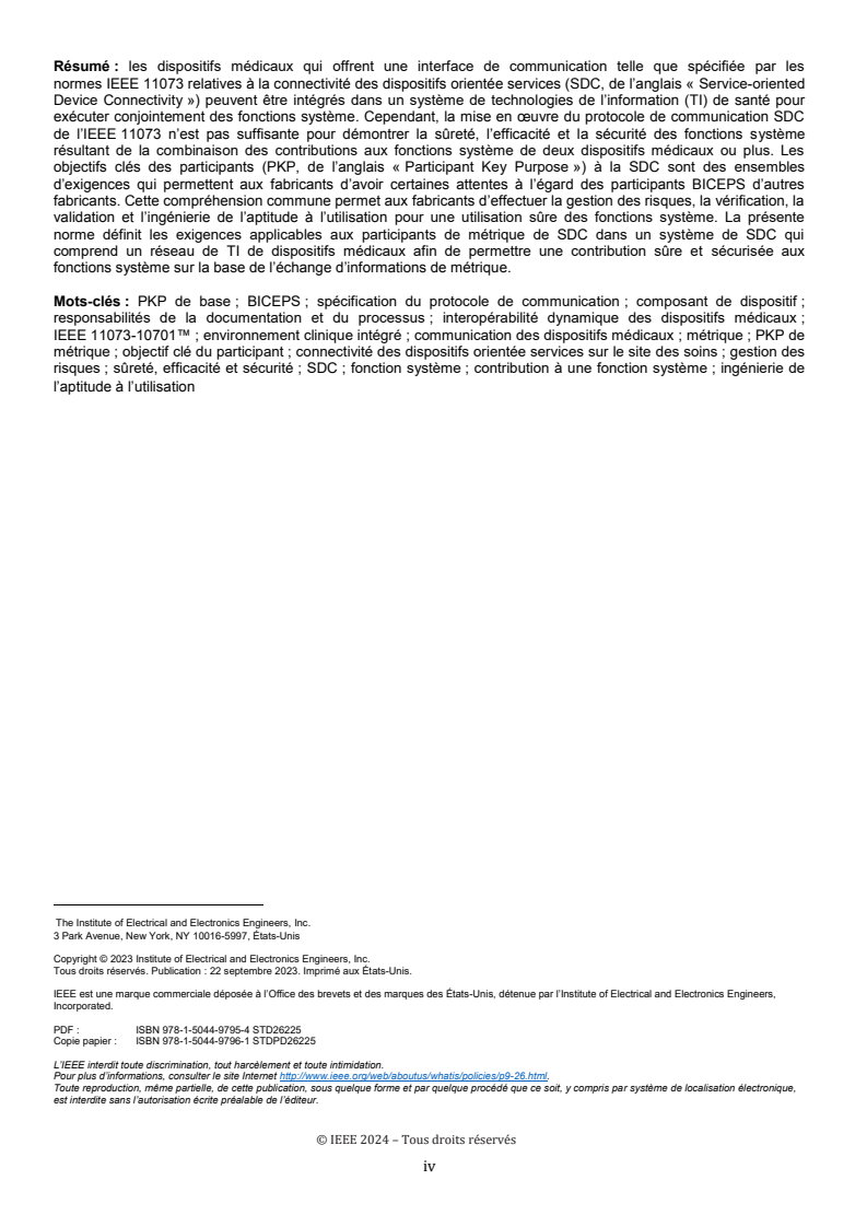 ISO/IEEE 11073-10701:2024 - Informatique de santé — Interopérabilité des dispositifs — Partie 10701: Communication entre dispositifs médicaux sur le site de soins — Fourniture de métriques par les participants à un système de connectivité des dispositifs orientée services (SDC) Released:16. 09. 2024