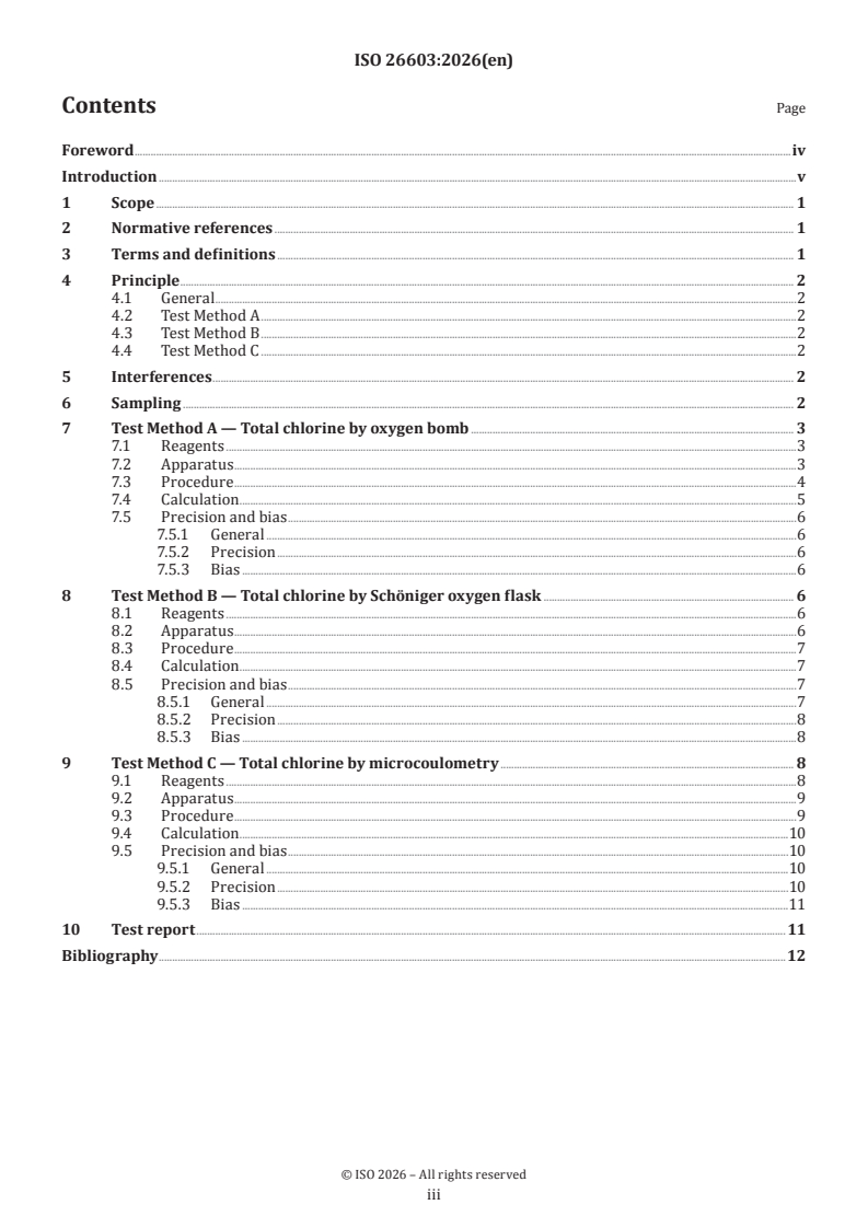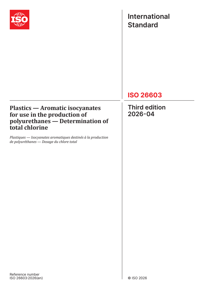 ISO 26603:2026 is a standard published by the International Organization for Standardization (ISO). Its full title is "Plastics — Aromatic isocyanates for use in the production of polyurethanes — Determination of total chlorine". This standard covers: This document specifies the determination of the total chlorine content of aromatic isocyanates used in the preparation of polyurethanes. The difference between the total chlorine content and the hydrolyzable chlorine content (see ISO 15028) is a measure of the process solvents left in the product. All the test methods are applicable to a variety of organic compounds, including aliphatic isocyanates, but the amount of sample used might need to be adjusted. These test methods can be used for research or for quality control.
