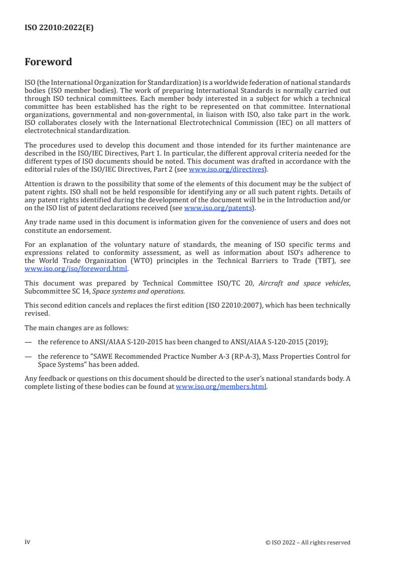 ISO 22010:2022 is a standard published by the International Organization for Standardization (ISO). Its full title is "Space systems - Mass properties control". This standard covers: This document describes a process for managing, controlling and monitoring the mass properties of space systems. The relationship between this management plan and the performance parameters for mass properties to be met throughout the mission is described. Ground handling, dynamics analysis and test set-ups that rely on accurate mass properties inputs are identified. This document covers all programme phases from pre-proposal through to end of life.