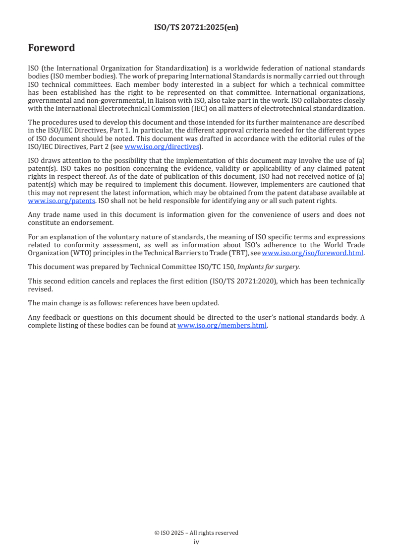 ISO/TS 20721:2025 is a technical specification published by the International Organization for Standardization (ISO). Its full title is "Implants for surgery - Absorbable implants - General guidelines and requirements for assessment of absorbable metallic implants". This standard covers: This document establishes the currently recognized approaches and special considerations needed when evaluating the in vitro and in vivo performance of absorbable metals and implants fabricated, in whole or in part, from them. This document describes how the evaluation of these metals can differ from those utilized for permanent non-absorbable implantable implants (or subcomponents), in that absorbable metal implants (or subcomponents) are – by design – intended to be absorbed in their entirety by the host. This document provides guidance regarding the materials considerations, in vitro degradation/fatigue characterization, and biological evaluation of medical implants made of absorbable metals. The provided content is intended to deliver added clarity to the evaluation of these materials and implants to increase awareness of critical factors and reduce potential for generation of erroneous or misleading test results. While this document and the herein described referenced standards contain many suggested alterations or modifications to currently practiced procedures or specifications, the provided content is intended to complement, and not replace, current conventions regarding the assessment of implantable implants. This document covers the evaluation of absorbable metal specific attributes in general and is not intended to cover application or implant specific considerations. Thus, it is important to consult relevant implant and/or application specific standards. This document does not apply to non-absorbable or non-metallic components (e.g. polymeric coatings, pharmaceuticals, non-absorbable metals) used in conjunction with absorbable metal implants.