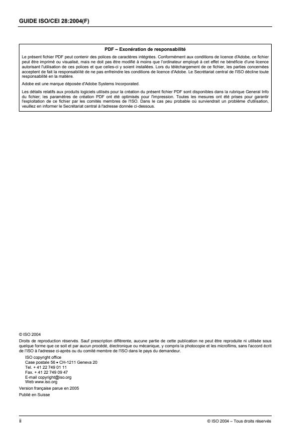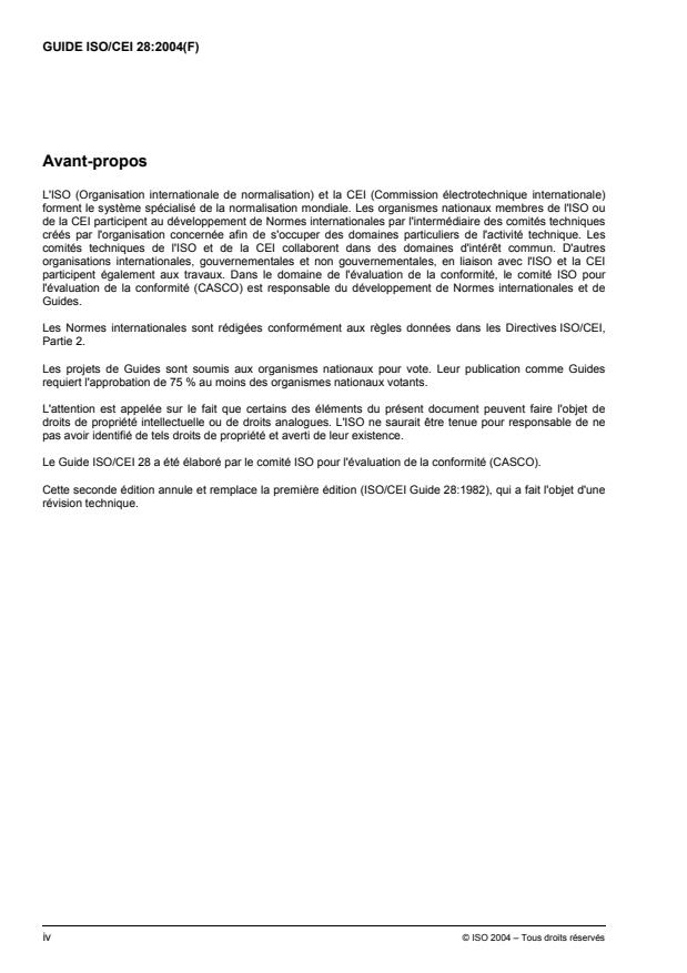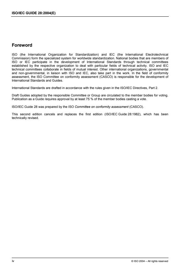 L'ISO/CEI Guide 28:2004 donne les lignes directrices générales pour un système spécifique de certification des produits. Il s'applique à un système de certification des produits par une tierce partie visant à établir la conformité d'un produit aux exigences spécifiées au moyen d'essais initiaux sur des échantillons de produit, de l'évaluation et de la surveillance du système qualité concerné, ainsi que de la surveillance par le biais d'essais sur des échantillons de produits provenant de l'usine ou du commerce, voire des deux. Le présent Guide traite des conditions d'utilisation de la marque de conformité et de délivrance du certificat de conformité.