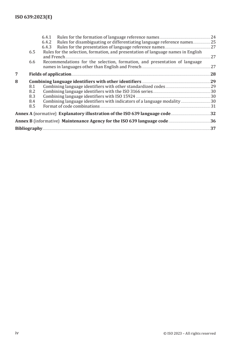 This document specifies the ISO 639 language code and establishes the harmonized terminology and general principles of language coding. It provides rules for the selection, formation, presentation and use of language identifiers as well as language reference names. It also gives provisions (i.e. principles, rules and guidelines) for the selection, formation and presentation of language names in English and French. Furthermore, it introduces provisions for the adoption of standardized language code elements using language names other than English or French. NOTE English, French and Russian are the official ISO languages. In addition, this document gives guidance on the use of language identifiers and describes their possible combination with identifiers of other codes. Specifically excluded from the ISO 639 language code are reconstructed languages or formal languages, such as computer programming languages and markup languages. The ISO 639 language code is maintained by the ISO 639 Maintenance Agency (ISO 639/MA) (see Annex B).