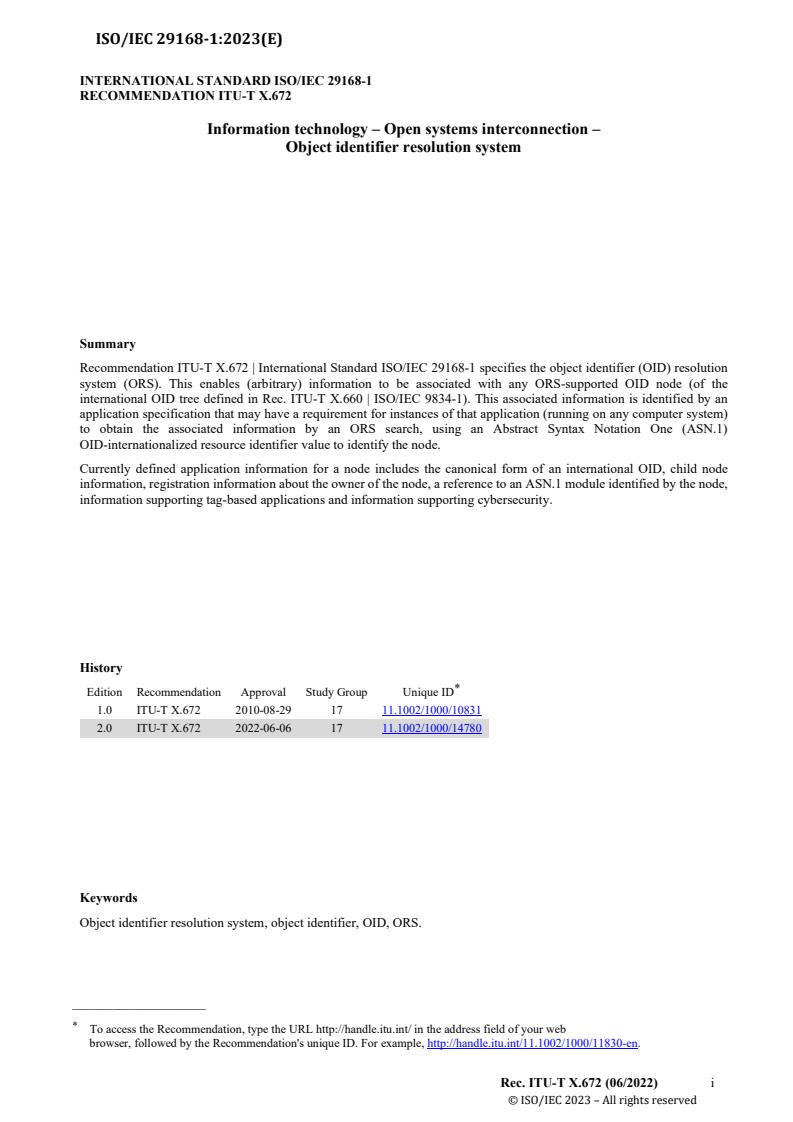 Keywords: ISO/IEC 29168-1:2023, ORS, OID resolution system, OID-IRI, DNS, COID, CINF, RINF, MINF, ASN.1, DNS zone files, NAPTR, caching.