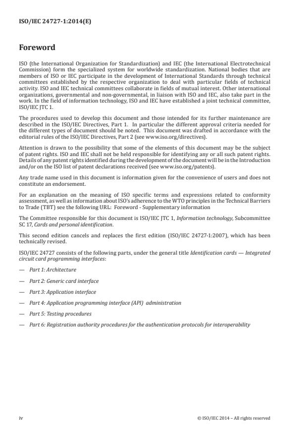 ISO/IEC 24727-1:2014 is a standard published by the International Organization for Standardization (ISO). Its full title is "Identification cards - Integrated circuit card programming interfaces - Part 1: Architecture". This standard covers: ISO/IEC 24727 specifies a set of programming interfaces and protocols enabling interactions between integrated circuit cards (ICCs) and applications resident on a variety of computer platforms. The ICCs provide generic services for multi-sector use by the applications. The organization and the operation of the ICCs conform to ISO/IEC 7816 4. It is anticipated that some application domains will seek to achieve interoperability through ISO/IEC 24727 facilities even though the applications pre-exist these facilities. To this end, various means of backward compatibility are established through mechanisms specified in ISO/IEC 24727. ISO/IEC 24727-1:2014 specifies system architecture and principles of operation, the means for achieving interoperability among diverse application domains, the conceptual service and data models that span the relevant application domains, and the rationale for trusted processes enabled under these models.