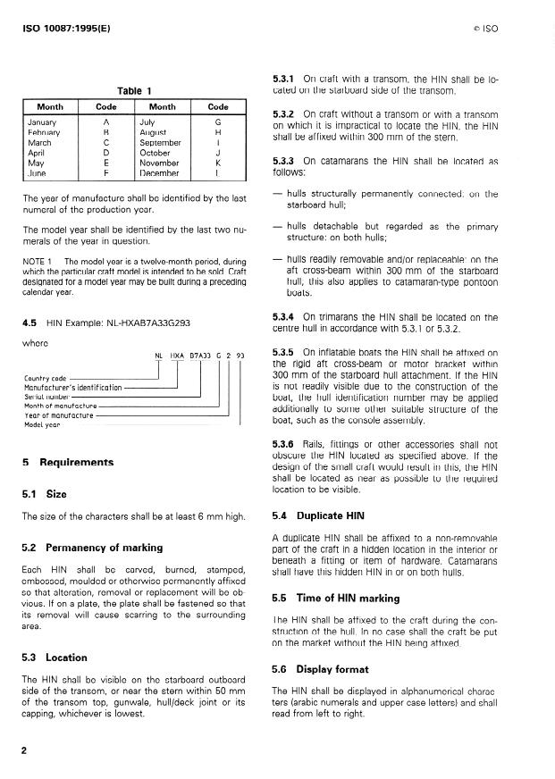 ISO 10087:1995 is a standard published by the International Organization for Standardization (ISO). Its full title is "Small craft — Hull identification — Coding system". This standard covers: Cancels and replaces the first edition (1990). Establishes a coding system to achieve identification of any small craft hull, concerning: identification code of the country and of the manufacturer; serial number; month and year of production; model year. Applies to small craft of all types and materials, of length of hull of up to 24 m. Does not apply to beach or bathing toys.
