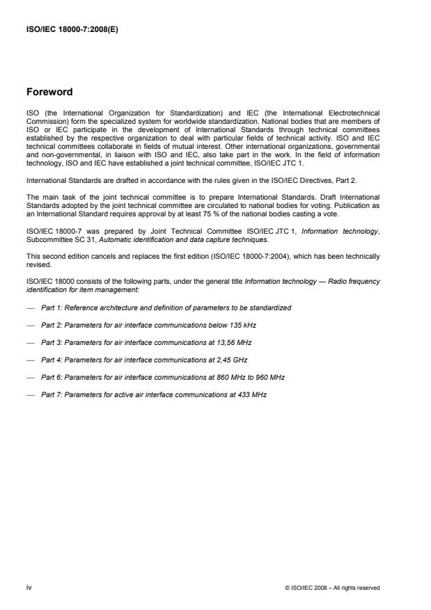 ISO/IEC 18000-7:2008 defines the air interface for radio frequency identification (RFID) devices operating as an active RF tag in the 433 MHz band used in item management applications. The purpose of ISO/IEC 18000-7:2008 is to provide a common technical specification for RFID devices that may be used by ISO committees developing RFID application standards. ISO/IEC 18000-7:2008 is intended to allow for compatibility and to encourage interoperability of products for the growing RFID market in the international marketplace. It defines the forward and return link parameters for technical attributes including, but not limited to, operating frequency, operating channel accuracy, occupied channel bandwidth, maximum power, spurious emissions, modulation, duty cycle, data coding, bit rate, bit rate accuracy, bit transmission order and, where appropriate, operating channels, frequency hop rate, hop sequence, spreading sequence and chip rate. ISO/IEC 18000-7:2008 further defines the communications protocol used in the air interface.