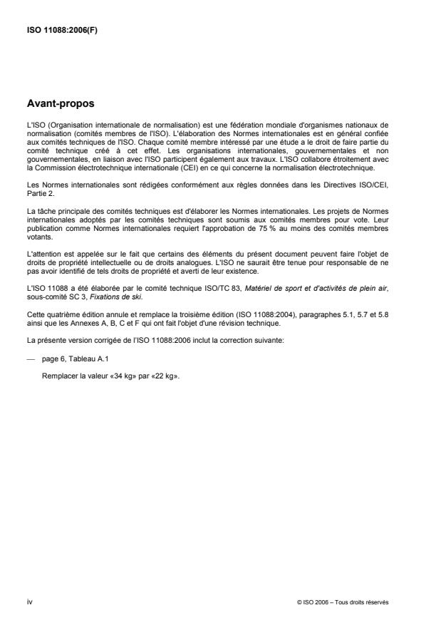 L'ISO 11088:2006 spécifie des modes opératoires de montage, de réglage et de contrôle des mécanismes de fixation des skis, en intégrant de manière pratique les exigences de Normes internationales relatives aux skis, aux fixations de ski et aux chaussures de ski. L'ISO 11088:2006 s'adresse à toutes les personnes et institutions concernées par ces modes opératoires et notamment aux détaillants d'articles de sport. L'ISO 11088:2006 est applicable à l'ensemble ski/fixation/chaussure (SFC) des skis alpins, dont l'utilisateur possède au moins un des composants.