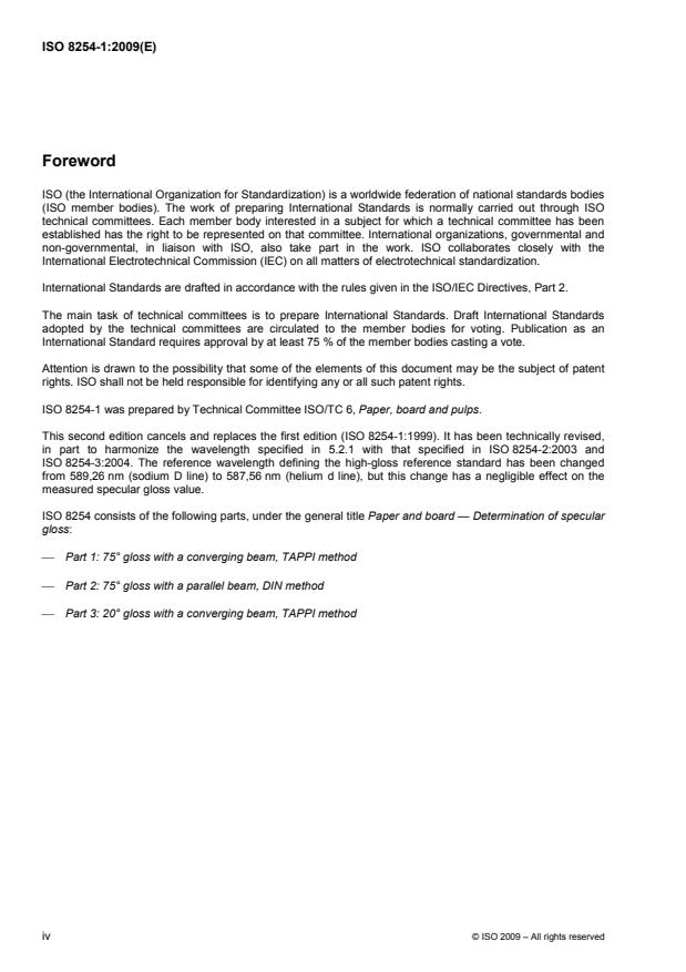 ISO 8254-1:2009 is a standard published by the International Organization for Standardization (ISO). Its full title is "Paper and board - Measurement of specular gloss - Part 1: 75 degree gloss with a converging beam, TAPPI method". This standard covers: ISO 8254-1:2009 specifies a method for measuring the specular gloss of paper at an angle of 75° to the normal to the paper surface. Although its chief application is to coated papers, it may also be used for glossy uncoated papers such as supercalendered papers.