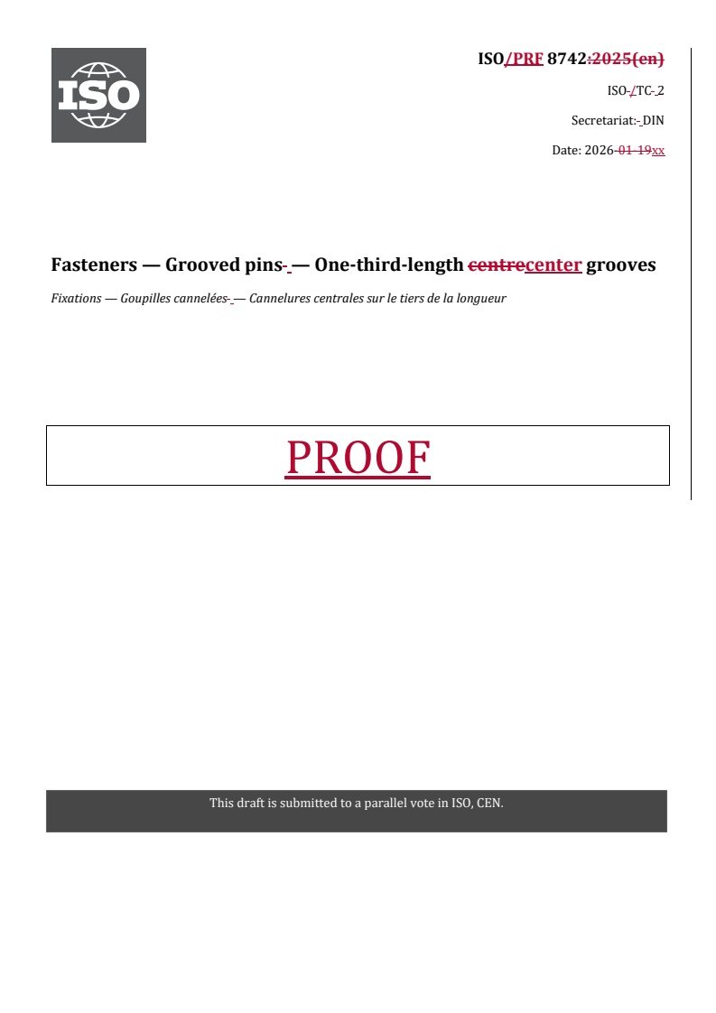 prEN ISO 8742 - Fasteners - Grooved pins - One-third-length center grooves (ISO/DIS 8742:2025) - Effective Date