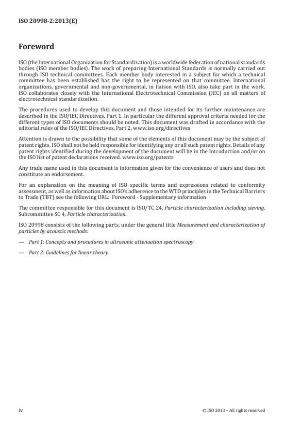 ISO 20998-2:2013 is a standard published by the International Organization for Standardization (ISO). Its full title is "Measurement and characterization of particles by acoustic methods — Part 2: Guidelines for linear theory". This standard covers: ISO 20998-2:2013 describes ultrasonic attenuation spectroscopy methods for determining the size distributions of a particulate phase dispersed in a liquid at dilute concentrations, where the ultrasonic attenuation spectrum is a linear function of the particle volume fraction. In this regime, particle?particle interactions are negligible. Colloids, dilute dispersions, and emulsions are within the scope of ISO 20998-2:2013. The typical particle size for such analysis ranges from 10 nm to 3 mm, although particles outside this range have also been successfully measured. For solid particles in suspension, size measurements can be made at concentrations typically ranging from 0,1 % volume fraction up to 5 % volume fraction, depending on the density contrast between the solid and liquid phases, the particle size, and the frequency range. For emulsions, measurements may be made at much higher concentrations. These ultrasonic methods can be used to monitor dynamic changes in the size distribution. While it is possible to determine the particle size distribution from either the attenuation spectrum or the phase velocity spectrum, the use of attenuation data alone is recommended. The relative variation in phase velocity due to changing particle size is small compared to the mean velocity, so it is often difficult to determine the phase velocity with a high degree of accuracy, particularly at ambient temperature. Likewise, the combined use of attenuation and velocity spectra to determine the particle size is not recommended. The presence of measurement errors (i.e. "noise") in the magnitude and phase spectra can increase the ill-posed nature of the problem and reduce the stability of the inversion.