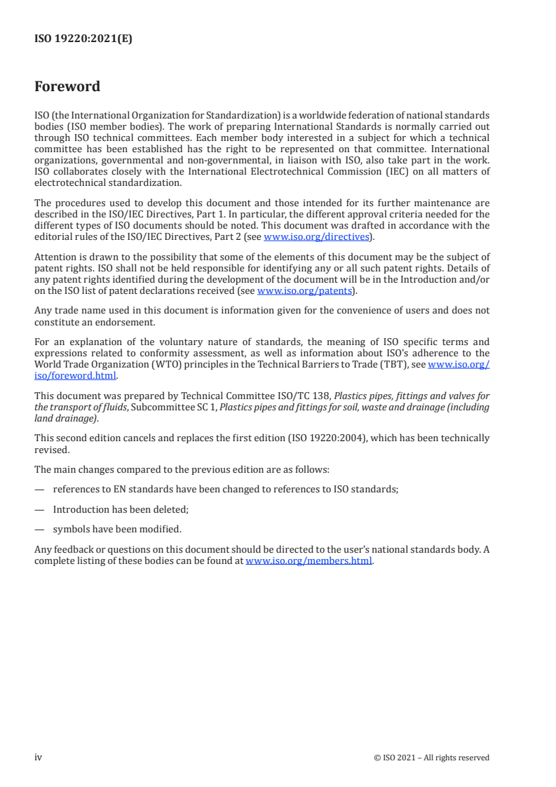 Keywords: ISO 19220:2021, SAN + PVC, plastics piping systems, soil and waste discharge, elastomeric ring seal joints, solvent cement joints, building drainage, ventilation pipework.