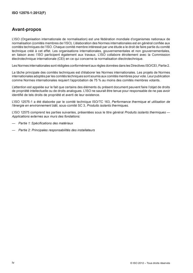 ISO 12575-1:2012 specifies the basic performance requirements for the insulating materials that form part of insulating systems used on the exterior of foundations and slabs where the insulation is in direct contact with the ground. ISO 12575-1:2012 does not address exterior insulating systems for foundations permanently immersed in water.