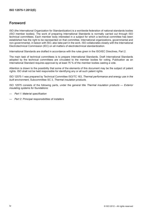 ISO 12575-1:2012 is a standard published by the International Organization for Standardization (ISO). Its full title is "Thermal insulation products — Exterior insulating systems for foundations — Part 1: Material specification". This standard covers: ISO 12575-1:2012 specifies the basic performance requirements for the insulating materials that form part of insulating systems used on the exterior of foundations and slabs where the insulation is in direct contact with the ground. ISO 12575-1:2012 does not address exterior insulating systems for foundations permanently immersed in water.