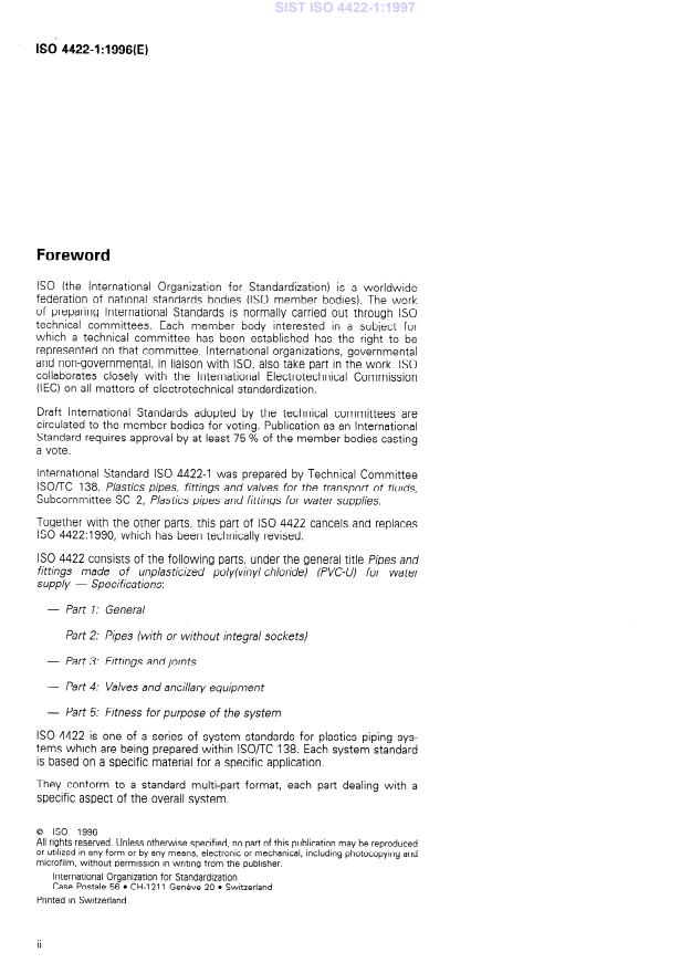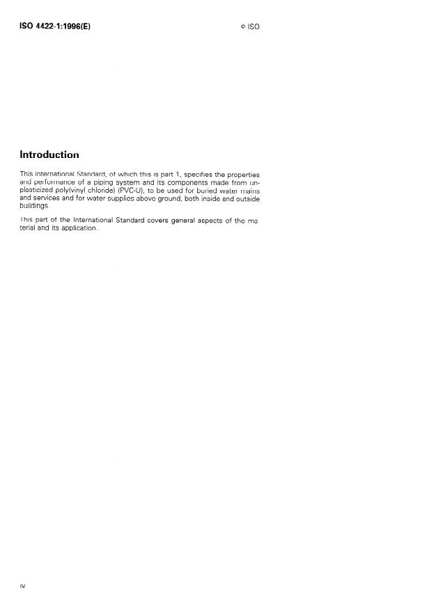 ISO 4422-1:1996 is a standard published by the International Organization for Standardization (ISO). Its full title is "Pipes and fittings made of unplasticized poly(vinyl chloride) (PVC-U) for water supply — Specifications — Part 1: General". This standard covers: Specifies the general aspects of pipes, joints, fittings and ancillaries, made of unplasticized poly(vinyl chloride) (PVC-U), for piping systems intended to be used for buried water mains and for water supplies above ground, both inside and outside buildings. Replaces ISO 4422:1990.