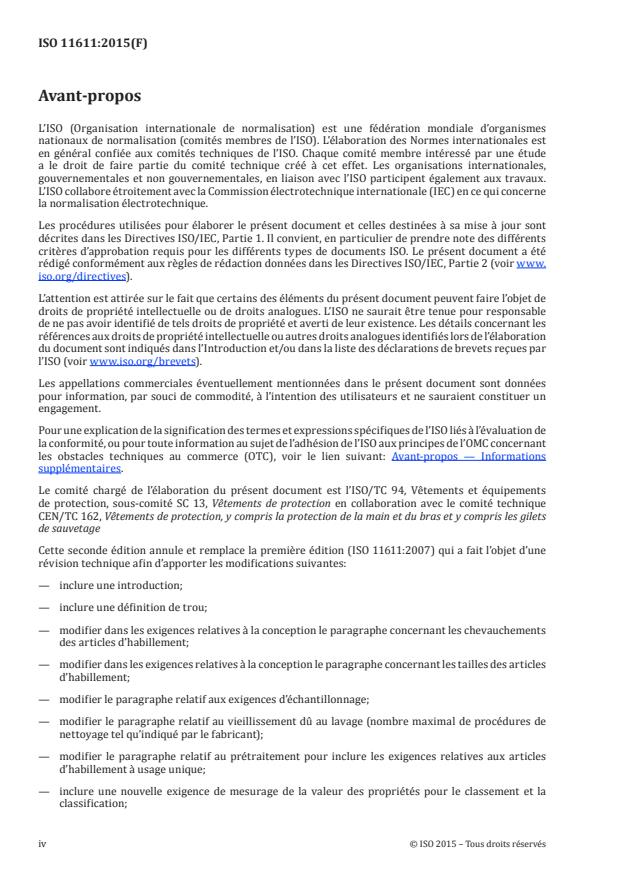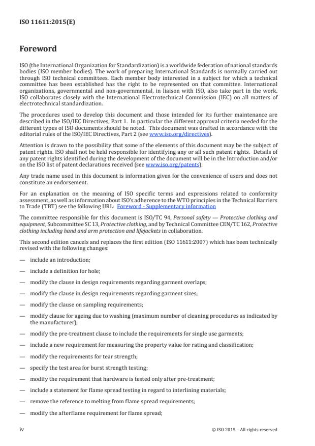 L'ISO 11611:2015 spécifie les exigences essentielles de sécurité minimales et les méthodes d'essai des vêtements de protection, comprenant les cagoules, les tabliers, les manches et les guêtres, destinés à protéger le corps de l'utilisateur, y compris la tête (cagoules) et les pieds (guêtres) et qui doivent être portés durant des opérations de soudage et autres techniques connexes ayant des risques comparables. Pour la protection de la tête et des pieds, l'ISO 11611:2015 s'applique seulement pour les cagoules et les guêtres. L'ISO 11611:2015 ne couvre pas les exigences pour la protection de la main, du visage et/ou des yeux.