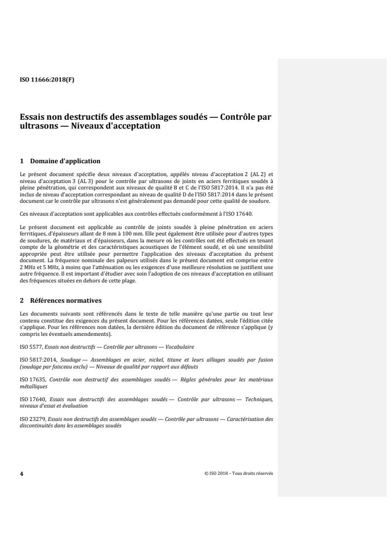 ISO 11666:2018 spécifie deux niveaux d'acceptation, appélés niveau d'acceptation 2 (AL 2) et niveau d'acceptation 3 (AL 3) pour le contrôle par ultrasons de joints en aciers ferritiques soudés à pleine pénétration, qui correspondent aux niveaux de qualité B et C de l'ISO 5817:2014. Il n'a pas été inclus de niveau d'acceptation correspondant au niveau de qualité D de l'ISO 5817:2014 dans le présent document car le contrôle par ultrasons n'est généralement pas demandé pour cette qualité de soudure. Ces niveaux d'acceptation sont applicables aux contrôles effectués conformément à l'ISO 17640. ISO 11666:2018 est applicable au contrôle de joints soudés à pleine pénétration en aciers ferritiques, d'épaisseurs allant de 8 mm à 100 mm. Il peut également être utilisé pour d'autres types de soudures, de matériaux et d'épaisseurs, dans la mesure où les contrôles ont été effectués en tenant compte de la géométrie et des caractéristiques acoustiques de l'élément soudé, et où une sensibilité appropriée peut être utilisée pour permettre l'application des niveaux d'acceptation du présent document. La fréquence nominale des palpeurs utilisés dans le présent document est comprise entre 2 MHz et 5 MHz, à moins que l'atténuation ou les exigences d'une meilleure résolution ne justifient une autre fréquence. Il est important d'étudier avec soin l'adoption de ces niveaux d'acceptation en utilisant des fréquences situées en dehors de cette plage.