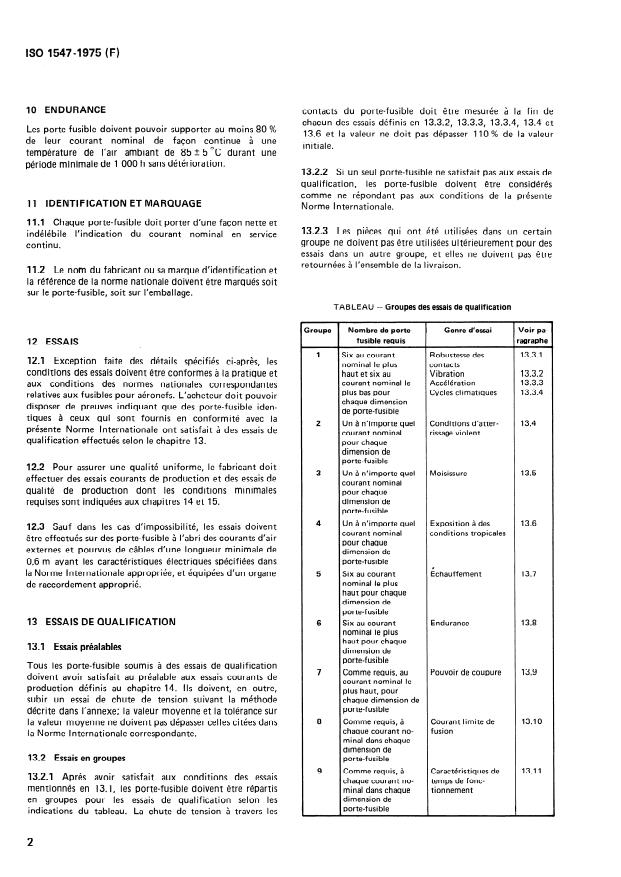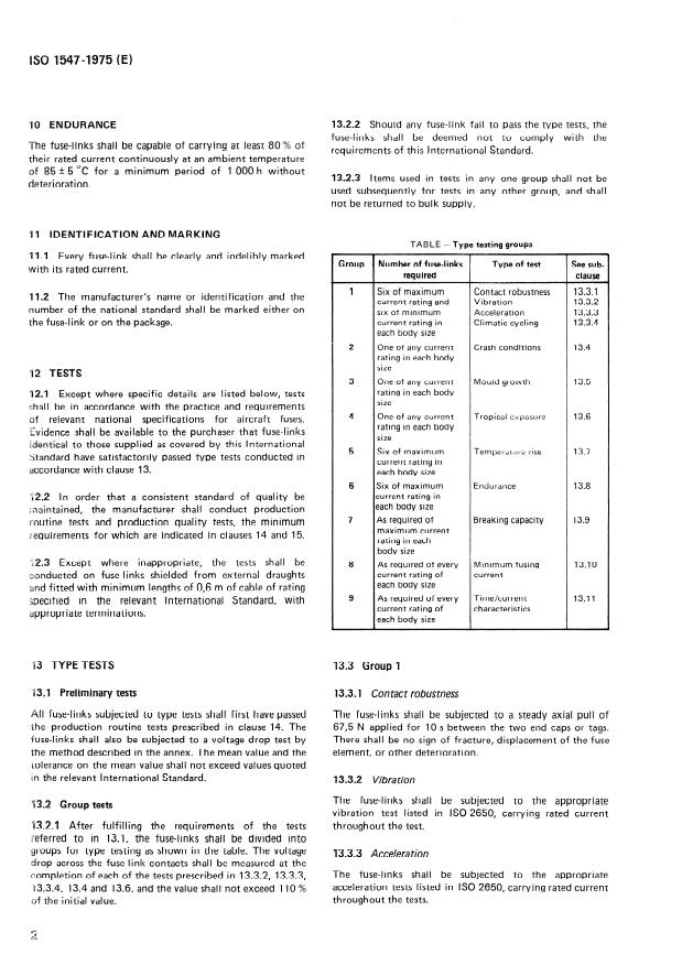 ISO 1547:1975 is a standard published by the International Organization for Standardization (ISO). Its full title is "Aircraft - Precision fuse-links - General requirements". This standard covers: Includes the requirements for these components for use in aircraft electrical systems having voltage and frequency characteristics conforming to ISO/R 222, at any ambient temperature from -65 to + 85 °C, and all altitudes from 0 to 24 000 m. Gives terminology, requirements for dimensions, temperature and altitude rating, current, voltage and breaking-capacity ratings, environment, temperature rise, time/current characteristics, endurance, identification and marking, tests, type tests, production routine test, production quality tests and a method of measurement of voltage drop.