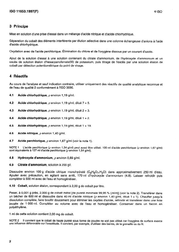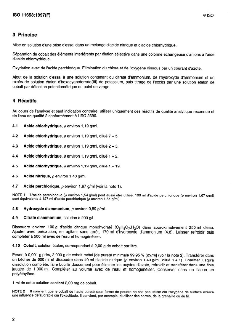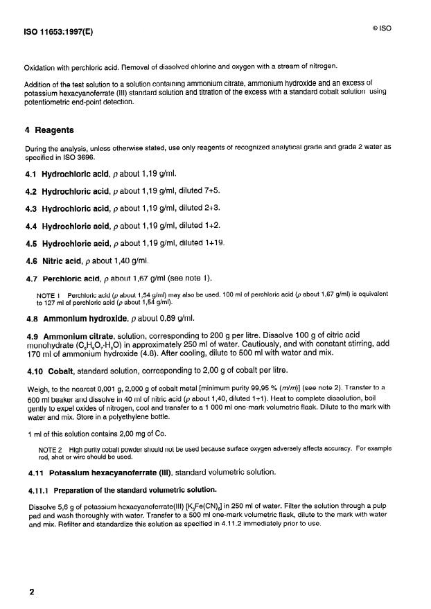 - Specified reagent grades and water (ISO 3696). Key reagents: HCl, HNO3, HClO4 (perchloric acid), ammonium citrate, ammonium hydroxide, potassium hexacyanoferrate(III) standard solution and a 2.00 g Co·L−1 cobalt standard.