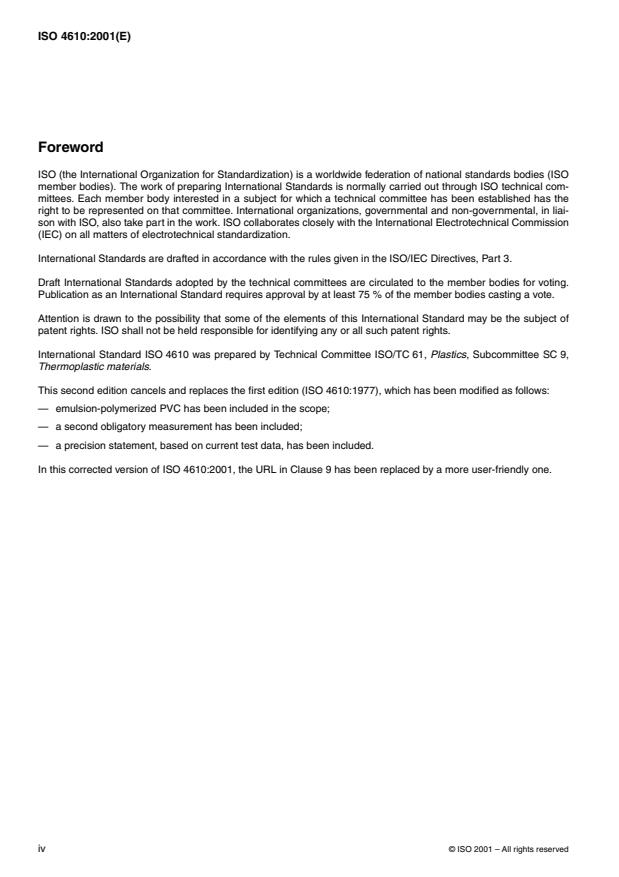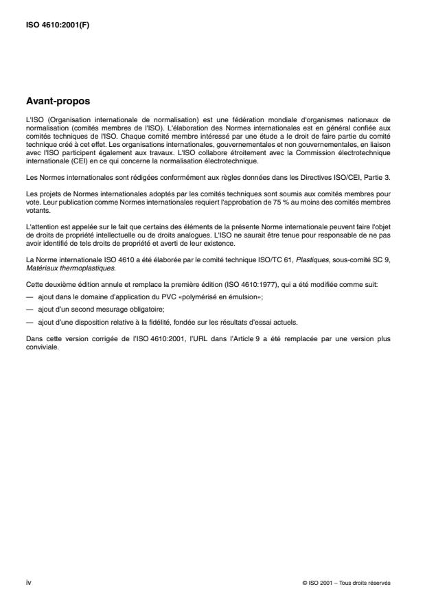 La Norme internationale ISO 4610 a été élaborée par le comité technique ISO/TC 61, Plastiques, sous-comité SC 9,