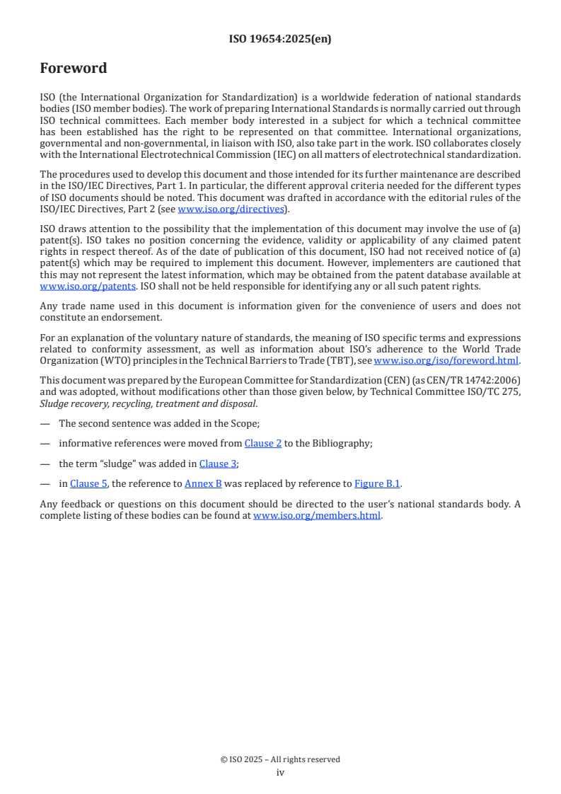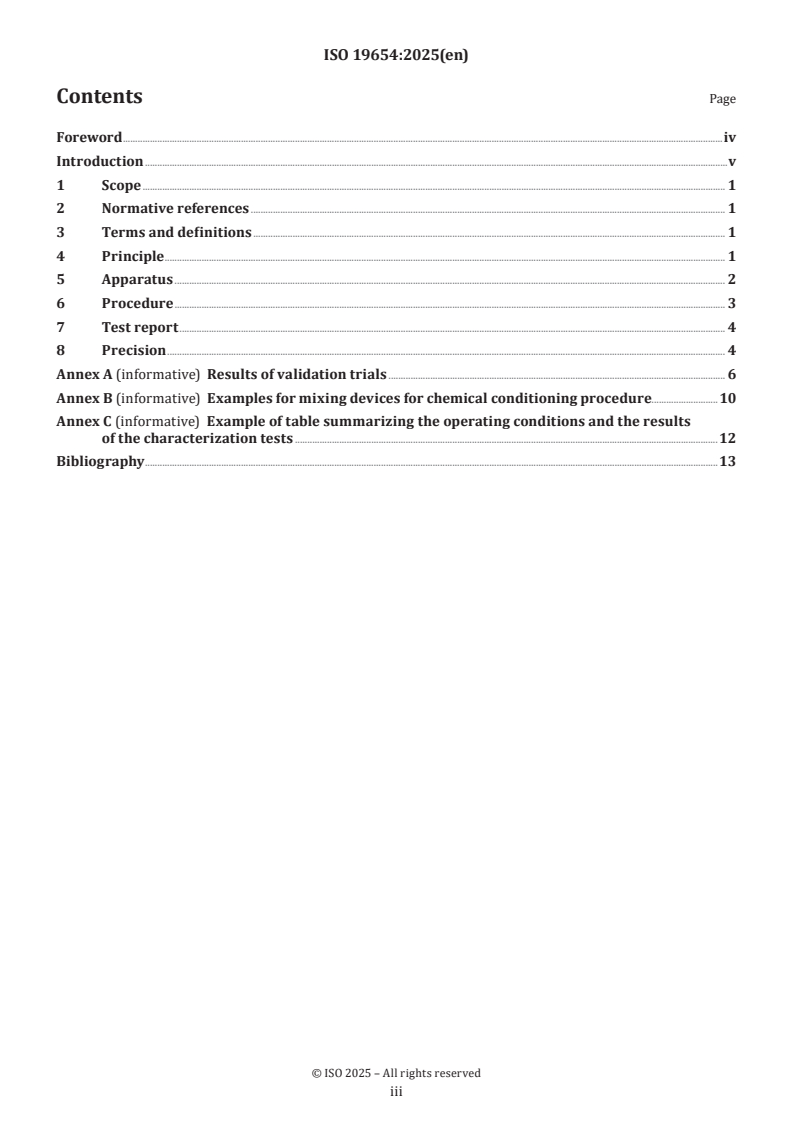 ISO 19654:2025 is a standard published by the International Organization for Standardization (ISO). Its full title is "Sludge recovery, recycling, treatment and disposal - Laboratory chemical conditioning procedure". This standard covers: This method gives a standardized procedure for the conditioning operation when selecting a conditioning product at laboratory scale and also for the production of flocculated thickened sludge for subsequent dewatering tests. This document provides a method for laboratory chemical conditioning of sludge. The method applies to sludges and suspensions from: - storm water handling; - urban wastewater collecting systems; - urban wastewater treatment plants; - industrial wastewater that has been treated similarly to urban wastewater; - water supply plants. This document is applicable to all sludge that can have similar environmental or health impacts, or both, with exclusion of hazardous sludge from industry and dredged sludge.