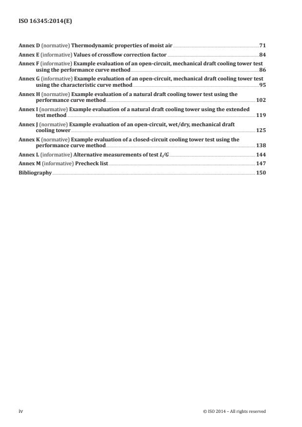 ISO 16345:2014 covers the measurement of the thermal performance and pumping head of open- and closed-circuit, mechanical draft, wet and wet/dry cooling towers and natural draft and fan-assisted natural draft, wet and wet/dry cooling towers. The standard rating boundaries for series mechanical draft, open- and closed-circuit cooling towers are specified. ISO 16345:2014 does not apply to the testing and rating of closed-circuit towers where the process fluid undergoes a change in phase as it passes through the heat exchanger or where the thermophysical properties of the process fluid are not available.