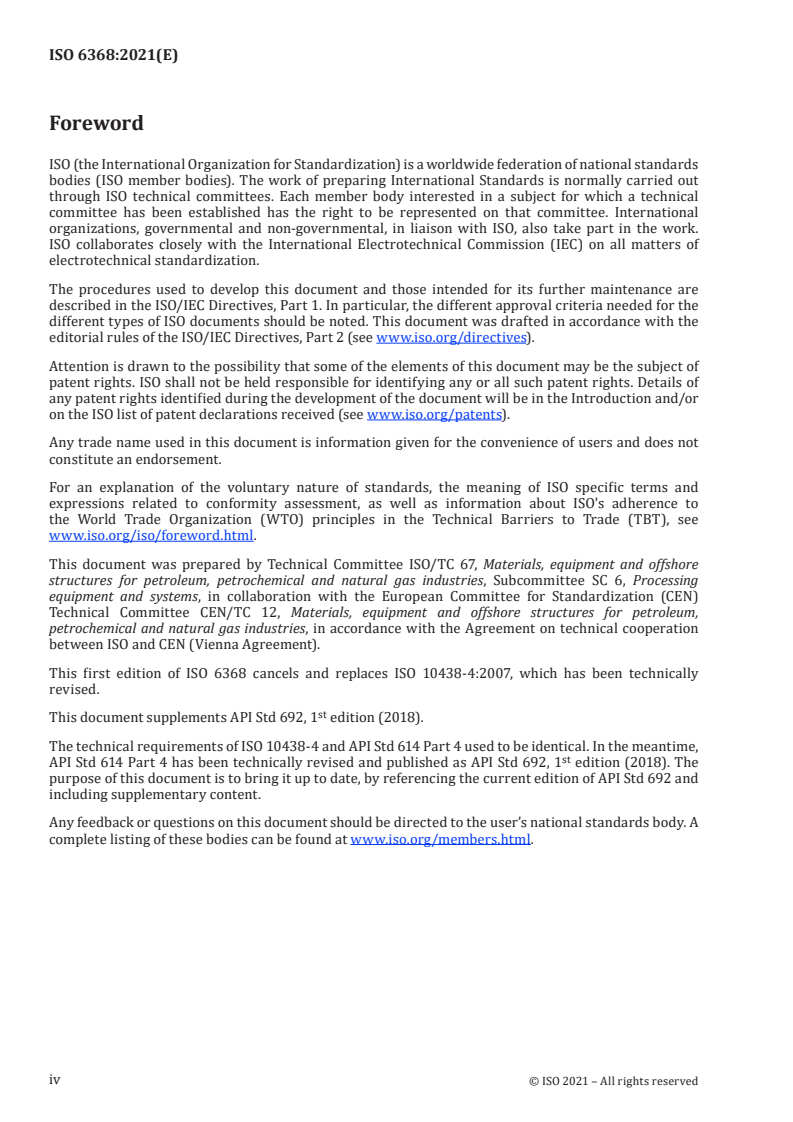 - Supplement to API Std 692: ISO 6368 complements API Std 692 standards by adapting specific requirements with references to ISO standards for materials, components, and system design.