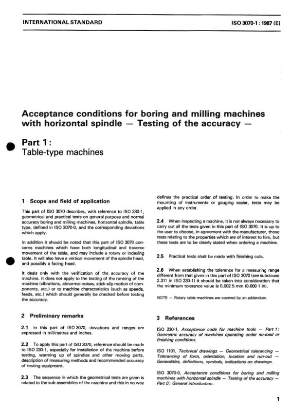 ISO 3070-1:1987 is a standard published by the International Organization for Standardization (ISO). Its full title is "Acceptance conditions for boring and milling machines with horizontal spindle — Testing of the accuracy — Part 1: Table-type machines". This standard covers: Acceptance conditions for boring and milling machines with horizontal spindle — Testing of the accuracy — Part 1: Table-type machines