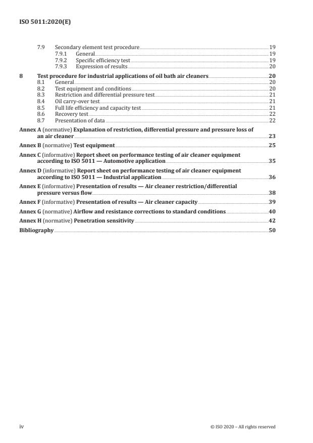 This document establishes and specifies uniform test procedures, conditions, equipment and a performance report to permit the direct laboratory performance comparison of air cleaners. The basic performance characteristics of greatest interest are air flow restriction or differential pressure, dust collection efficiency, dust capacity and oil carry-over on oil bath air cleaners. This test code therefore deals with the measurement of these parameters. This document is applicable to air cleaners used on internal combustion engines and compressors generally used in automotive and industrial applications.