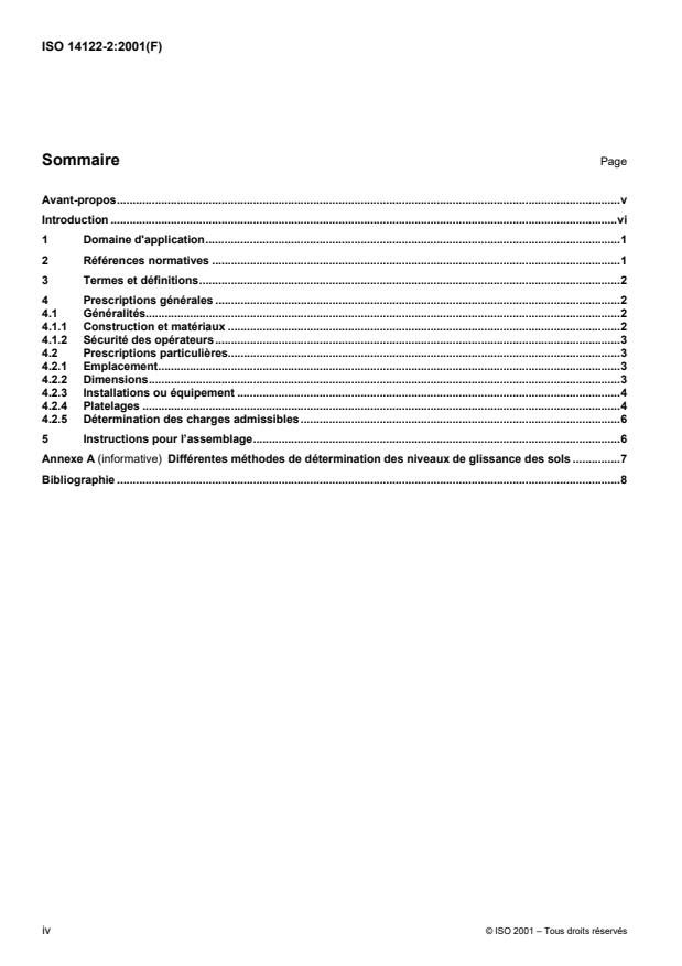 ISO 14122-2:2001 is a standard published by the International Organization for Standardization (ISO). Its full title is "Safety of machinery — Permanent means of access to machinery — Part 2: Working platforms and walkways". This standard covers: L'ISO 14122 définit les prescriptions générales de sécurité d'accès aux machines mentionnées dans l'EN 292-2. La partie 1 de l'ISO 14122 donne des recommandations concernant le choix approprié des moyens d'accès lorsque l'accès nécessaire à la machine n'est pas directement possible à partir du niveau du sol ou d'un plancher. La présente partie de l'ISO 14122 s'applique à toutes les machines (fixes ou mobiles) où des moyens d'accès fixes sont nécessaires. La présente partie de l'ISO 14122 s'applique aux plates-formes de travail et aux passerelles qui sont partie intégrante d'une machine. La présente partie de l'ISO 14122 peut s'appliquer également aux plates-formes de travail et aux passerelles donnant accès aux parties du bâtiment où la machine est installée, à condition que la fonction principale de cette partie du bâtiment soit de donner accès à la machine. NOTE La présente partie de l'ISO 14122 peut être utilisée également pour les moyens d'accès qui sont hors du domaine d'application de la présente partie de l'ISO 14122. Dans ce cas, il convient de tenir compte des éventuelles réglementations nationales ou autres. La présente partie de l'ISO 14122 s'applique également aux plates-formes de travail et aux passerelles spécifiques à la machine qui ne sont pas fixées de façon permanente sur la machine et qui peuvent être démontées ou déplacées sur le côté pour certaines opérations sur la machine (par exemple pour changer les outils d'une grande presse). La présente partie de l'ISO 14122 ne s'applique pas aux ascenseurs ou aux plates-formes élévatrices mobiles spécialement conçues pour soulever les personnes ou aux autres dispositifs spécifiques.
