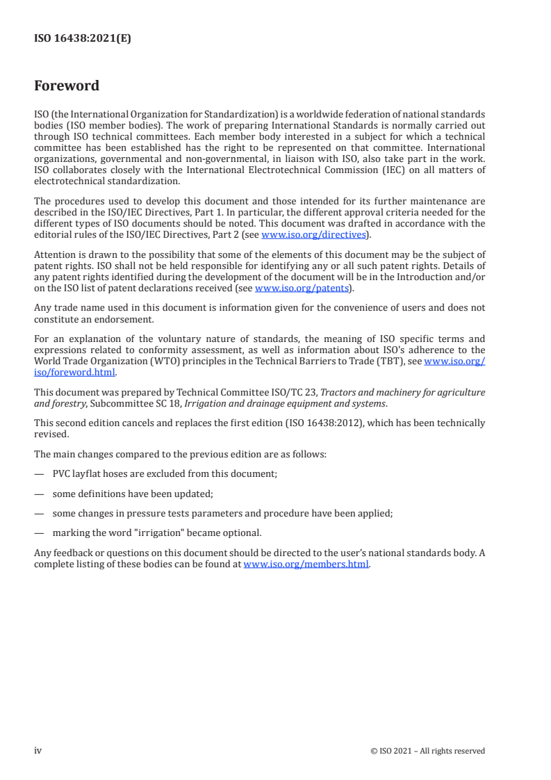 ISO 16438:2021 is a standard published by the International Organization for Standardization (ISO). Its full title is "Agricultural irrigation equipment — Thermoplastic collapsible hoses for irrigation — Specifications and test methods". This standard covers: This document specifies requirements and test methods for reinforced and non-reinforced thermoplastic collapsible hoses, intended to be used as main and sub-main supply lines for the conveyance and distribution of water for irrigation, at water temperatures up to 50 °C. PVC layflat hoses are excluded from this document. It is applicable to irrigation hoses with nominal diameters between 40 mm and 500 mm and working pressures between 0,3 bar (30 kPa) and 6 bar (600 kPa). This document is applicable to two types of hose configurations, with or without outlet connections (see Clause 4).