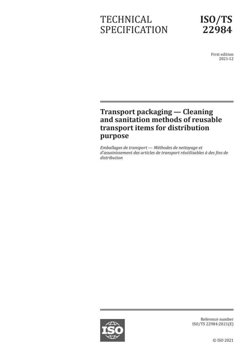 ISO/TS 22984:2021 is a technical specification published by the International Organization for Standardization (ISO). Its full title is "Transport packaging — Cleaning and sanitation methods of reusable transport items for distribution purpose". This standard covers: This document provides guidelines for the cleaning and sanitation procedures for the sanitary operation of reusable transport packaging, which are used in the fields of handling, transport, storage and display of food and non-food products. It is applicable to all reusable transport items including reusable rigid plastic distribution boxes defined in ISO 18616-1.