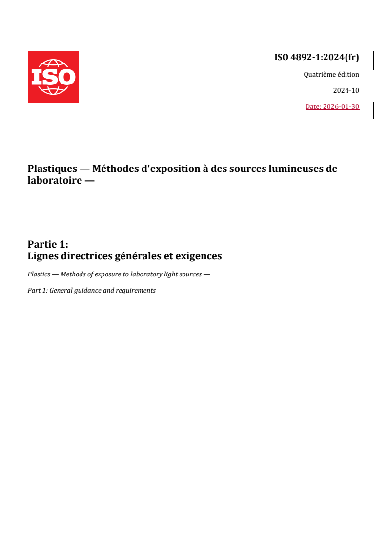 ISO 4892-1:2024 - Plastiques — Méthodes d'exposition a des sources lumineuses de laboratoire — Partie 1: Lignes directrices générales et exigences Released:2. 10. 2024