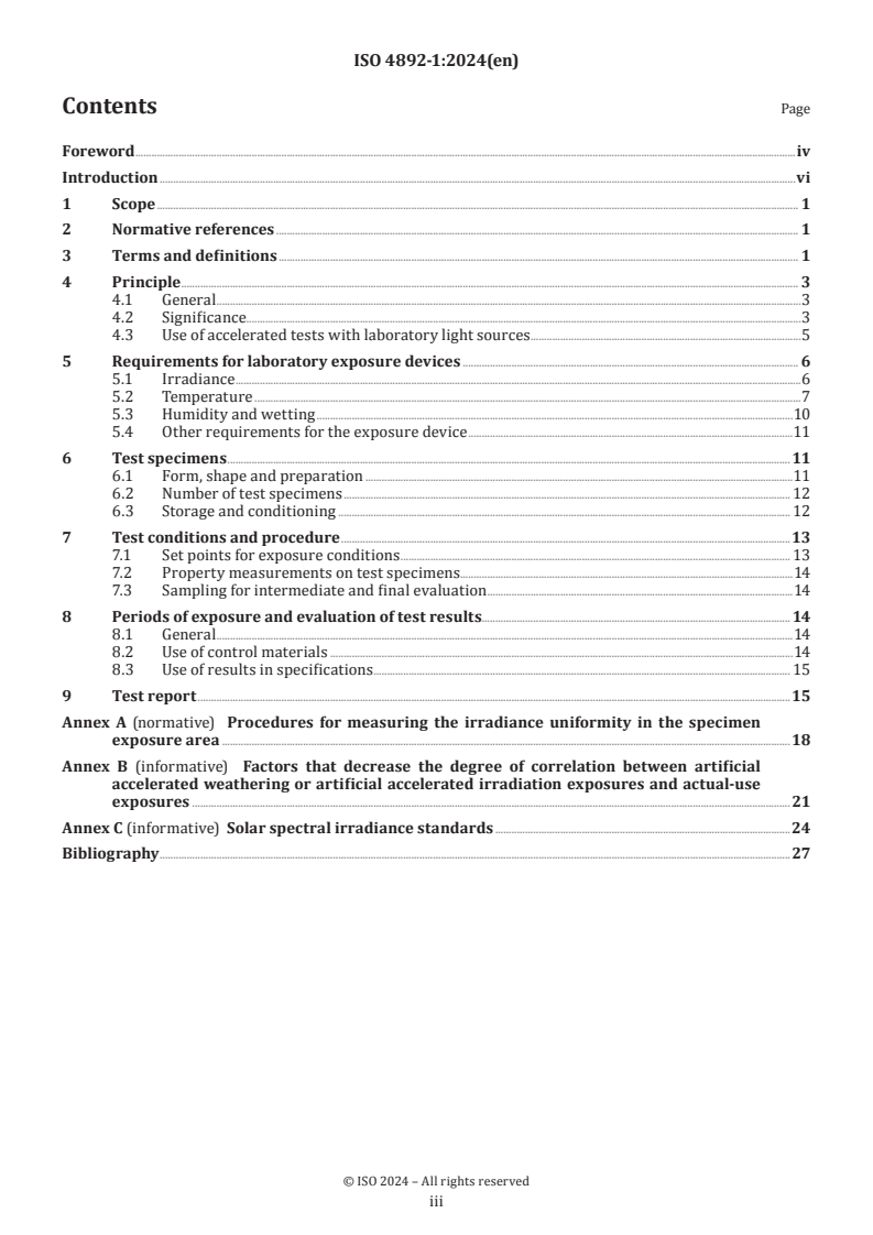 Keywords: ISO 4892-1:2024, plastics, accelerated weathering, laboratory light sources, irradiance, black-panel thermometer, test specimens, artificial accelerated irradiation.