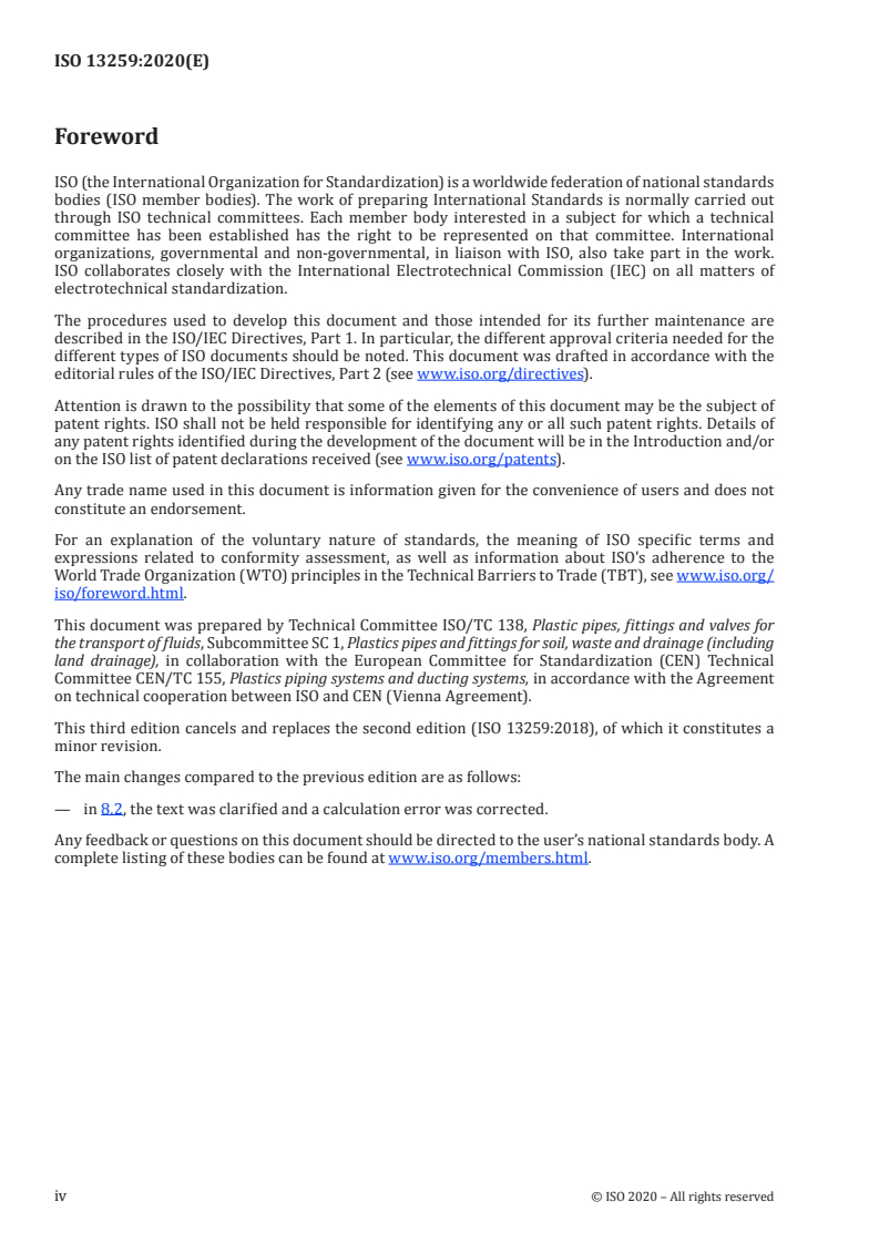 - ISO 13259:2020 was prepared by ISO/TC 138 (Plastic pipes) in cooperation with CEN/TC 155. Selection of specific test pressures, deflection magnitudes and acceptance criteria is typically set in the referring product standard. Keywords: ISO 13259:2020, thermoplastics piping, leaktightness test, elastomeric sealing ring, underground non‑pressure applications.