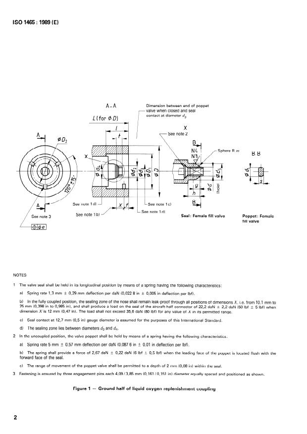 ISO 1465:1989 is a standard published by the International Organization for Standardization (ISO). Its full title is "Aircraft - Liquid oxygen replenishment couplings - Mating dimensions". This standard covers: Specifies the mating and clearance dimensions. The mating dimensions and characteristics of the ground half shall conform to those in figure 1 and table 1. The aircraft half shall mate with the ground half. The clearance envelope in the aircraft to accommodate the ground half for the purposes of coupling and uncoupling the hose unit shall be in accordance with figure 2 and table 2.