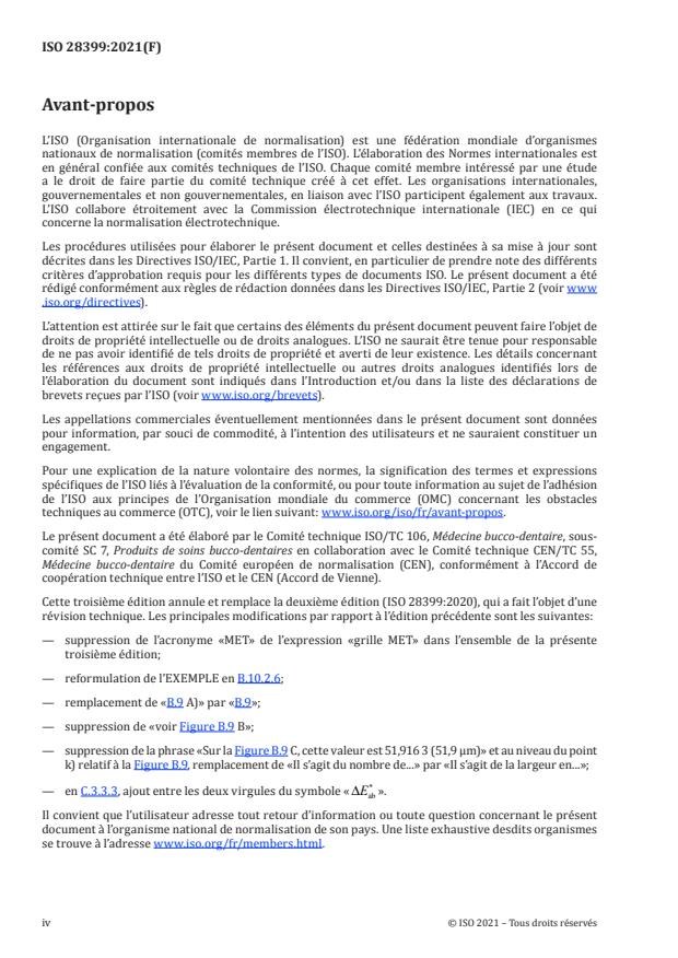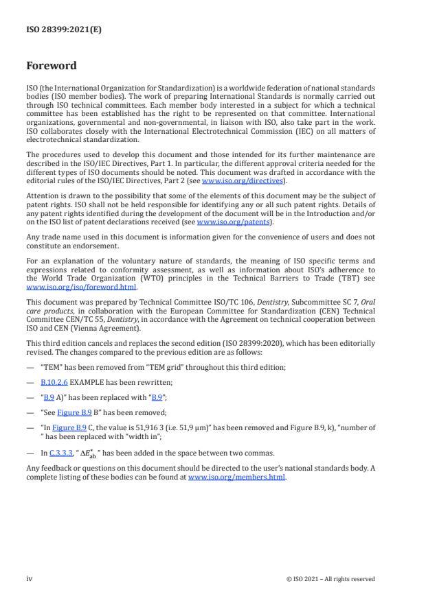 ISO 28399:2021 is a standard published by the International Organization for Standardization (ISO). Its full title is "Dentistry — External tooth bleaching products". This standard covers: This document specifies the requirements and test methods for external tooth bleaching products. These products are intended for use in the oral cavity, either by professional application (in-office tooth bleaching products) or consumer application (professional or non-professional home use of tooth bleaching products), or both. It also specifies requirements for their packaging, labelling and manufacturer's instructions for use. This document is not applicable to tooth bleaching products: — specified in ISO 11609; — intended to change colour perception of natural teeth by mechanical methods (e.g. stain removal) or using restorative approaches, such as veneers or crowns; — auxiliary or supplementary materials (e.g. tray materials) and instruments or devices (e.g. lights) that are used in conjunction with the bleaching products. This document does not specify biological safety aspects of tooth bleaching products. NOTE Maximum concentration of a bleaching agent for professional or non-professional use is subject to each country's regulatory body.