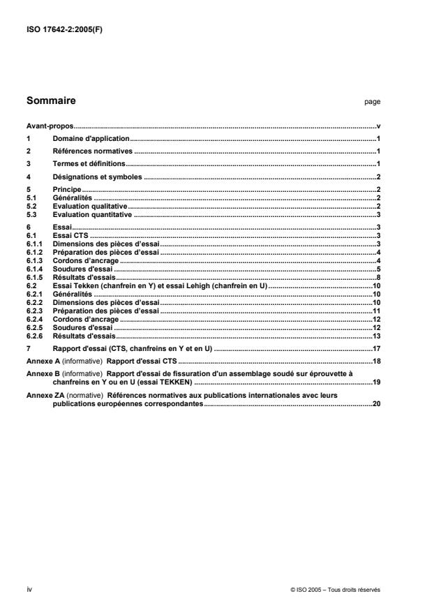 L'ISO 17642-2:2005 spécifie les dimensions des pièces d'essai, les éprouvettes et les modes opératoires pour les essais de fissuration à froid sur éprouvette auto-bridée suivants: essai CTS (Controlled Thermal Severity); essai Tekken (chanfrein en Y) ou essai Lehigh (chanfrein en U); afin d'obtenir des informations sur la sensibilité à la fissuration à froid lors du soudage. L'ISO 17642-2:2005 s'applique principalement, mais non exclusivement, aux aciers C-Mn et aux aciers non alliés.